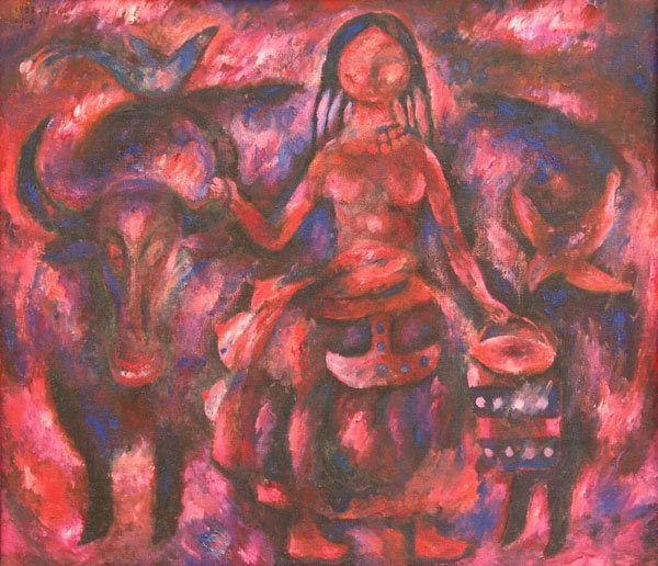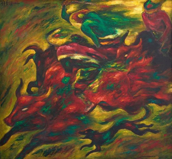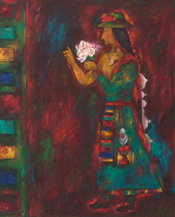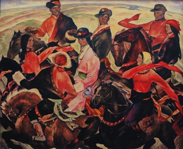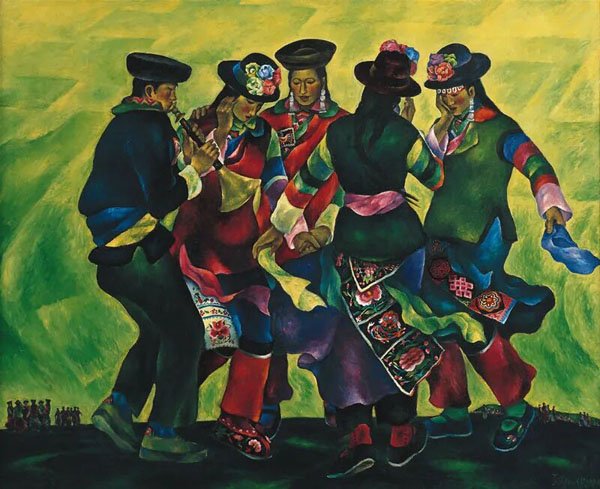 我们可以通过他这个时期的创作,比如《夕照》(1987)、《少女与牛》(1988)、《赛牦牛》(1990)等作品看到,他吸收了印象派对于光影与色彩的处理,用油画笔触捕捉光线在物体表面或者周围那种跳跃感和震颤感,让整个画面呈现出某种神性和神秘感。而在《白牡丹》(1993)和《门外的雪山》(1995)中,他将记忆中的人物、景象、场景等用现代主义的表现方式进行了重新的编排组合,赋予作品以某种象征性的内涵。又通过具有表现力的色彩与笔触,强化画面的情绪和感情,以表达他对自然、生命、神灵的敬畏。这个时期,他的很多画作既有宗教般的肃穆与神秘感,又充满了高原世俗生活的烟火气,诸如赛马、歌舞、劳作的人们。这种将神圣感注入日常,又将日常生活提升到一种仪式化的高度的方式,使得那个时期的作品普遍呈现出一种神性的光辉。