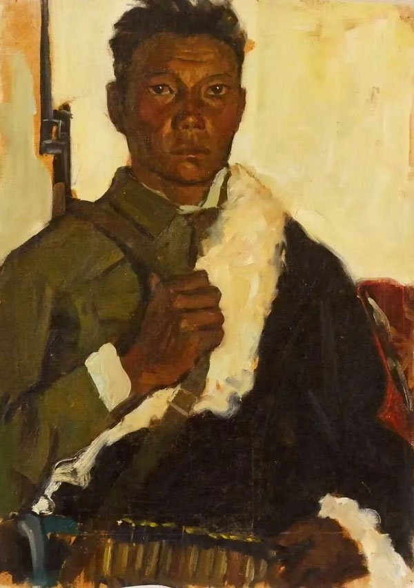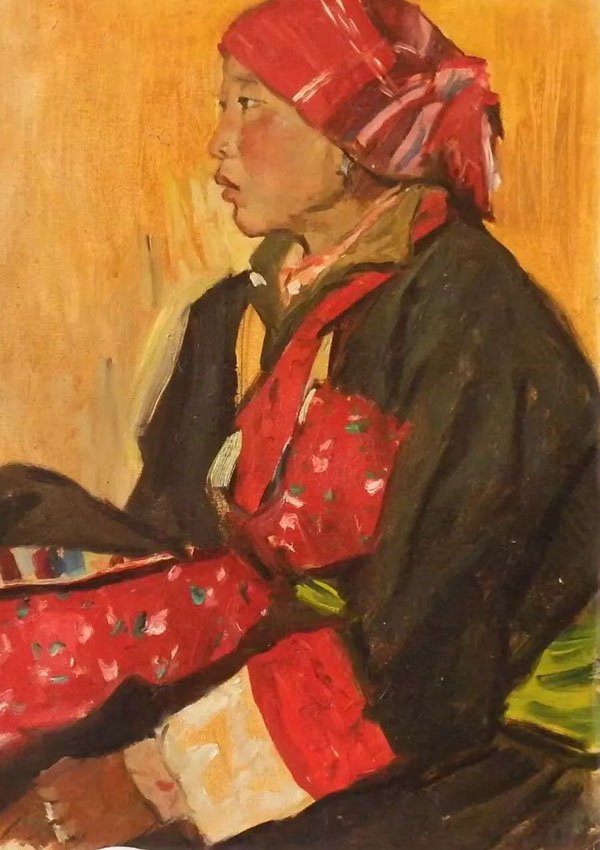 1970年代,鄂圭俊先生在青海开始艺术创作。本次展览中,笔者第一次看到他创作于1970年代的一大批写实主义风格的纸板油画《牧区人物写生》,从中可以看到他早年非常扎实的写生功夫。由于勤奋好学,他的进步很快,到 1980年代,他已经逐渐形成了其早期的艺术风格,先后入选全国美术展览并获奖。比如创作于1982年,油画《迎新娘》,获得“全国少数民族美术作品展览”一等奖。这件作品是他早期乡土现实风格的代表,画面整体构图非常紧凑与饱满,绘画语言概括凝练,色彩非常的主观、强烈与浓郁,显露出一些表现主义的倾向。