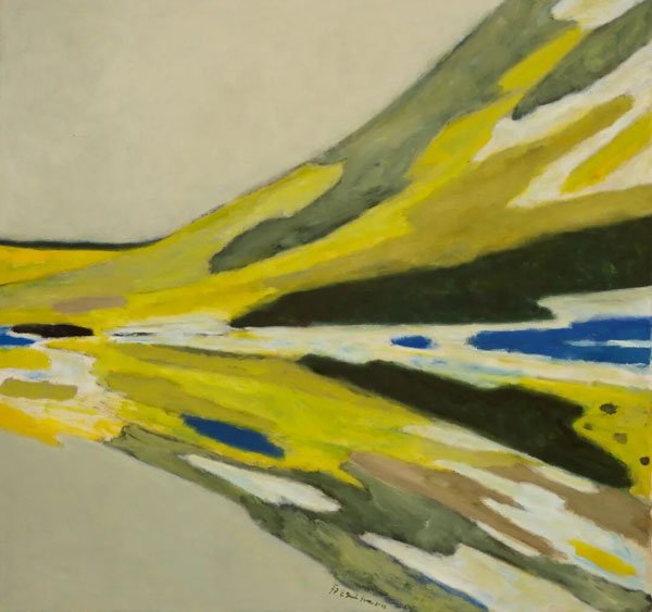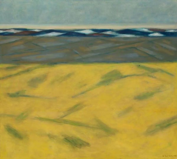 为此,鄂圭俊先生深入研究西方现代主义大师,但他学习的不是表面风格,而是解构与重组的方法论。他将这些方法“拿来”,用以分析和重组他熟悉的题材与青藏高原的地质地貌。同时,他又深入中国自己的传统文脉,将宋代山水“师法造化,再现自然”与元代山水“师法心源,表现自我”两种精神融合在他的《大自然系列》创作中。于是我们便看到,鄂圭俊先生笔下的大自然,不是某种具体的风景或物象,更多的是他对于西北青藏高原的印象和情感转换成的现代油画语汇。比如创作于2003年的《大自然系列03-5》中,有一大片明黄色块,如果从现代构成的角度,我们可以理解为画面形式构成的一部分,但实际上,它是西北地区大片油菜花的一种色彩意象。《大自然系列》中,鄂圭俊先生基本采用大色块,加上粗放的线条,再加拙朴、浑厚的油画笔触来表现,构成一种既简约又不简单的艺术震撼。很多时候,艺术是一种身体性与生命感的存在,它把语言不可言说的那部分显化出来。西北的巨大、西北的沉重、西北的特质,通过他的艺术表达,得以显影,得以被更大范围的世界和人群看到。