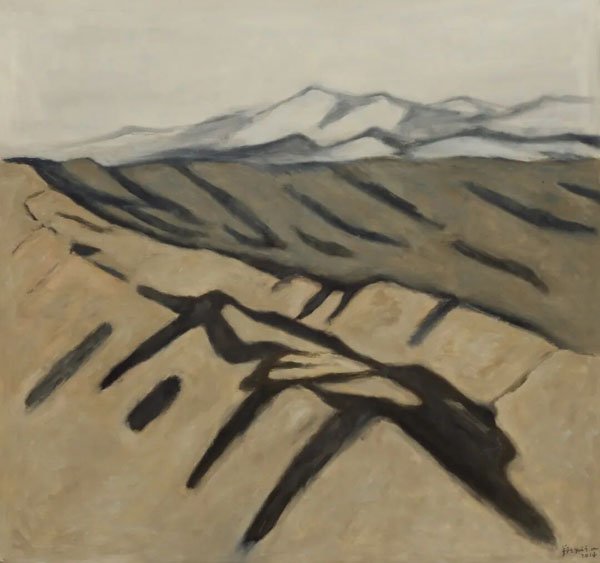 此系列的大部分作品均采用了空中俯瞰的视角,笔者猜想一方面可能与他数十年来往返到上海与青海之间的飞行经历;另一方面,也肯定与他长期研习中国书画所形成的观看方式有关。宋元式的山水,比如范宽的雄伟,倪瓒的疏淡,以及这套观看方式与审美原理背后所包含的“天人合一”东方式的哲学观,都深刻地构建了他这个时期创作的精神内涵,并形成了他后期“意象构成”的艺术风格。