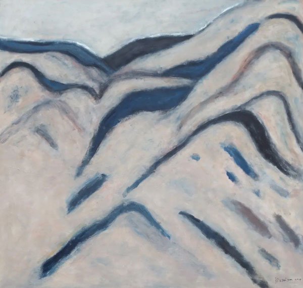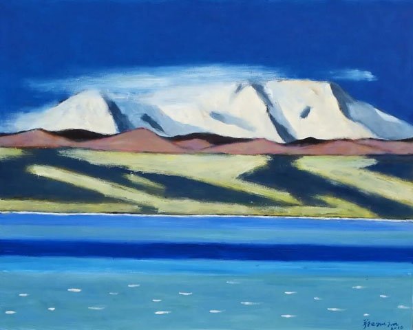 从中期开始,鄂圭俊的艺术探索中,就不再固守于地域风格,而是大胆地“穿越”到西方现代艺术的语境中。他吸收了比如表现主义强烈的情感宣泄、立体主义对结构的分解与重构、抽象艺术对形式与色彩的纯粹追求等。这使得他的作品既具有东方的灵魂,又具备了国际化的现代形式。你看他的《大自然系列》,大气磅礴,又内涵深邃、让人过目难忘。不仅展现了青海大自然的壮丽与神秘,更是对自身艺术风格不断探索、不断精进的一种深刻体现。他的油画艺术,把对大自然的敬畏与热爱,渗透到骨髓中,远远超越了自然风景、地理学的范畴。既有西北大地的厚重感,但也具有宋元山水画的平淡与从容,宁静致远的心理感受。在他的许多作品中,我们都能感受到一种超越现实的宗教情绪和神秘主义氛围,由此也赋予画面一种内省的、静穆的精神维度,引导观众在世俗生活中思考生命的本质与信仰的力量。因此,他的作品不仅是一种视觉享受,更是一种精神的洗礼。