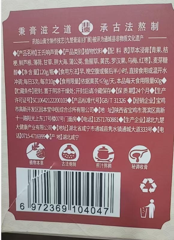 王氏响声膏,是祖传密方之一,主要为咽炎和候炎配制的药食同源,主要用于咽痒,咽痛,声代水肿,声音嘶哑的调理口感好,甜而不苦,无毒付作用。歌唱家必备佳品。