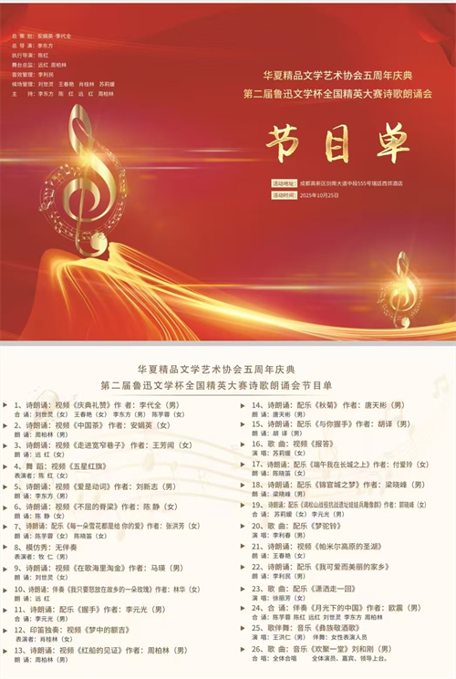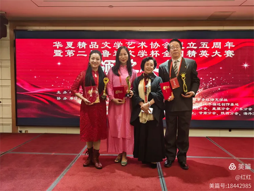 继后协会主席大赛总评委李代全又对大会和赛事作了总结性讲话;华夏精品文学艺术协会自成立以来,始终致力于推动文学创作的发展和创新。五年来,协会举办了多场文学讲座、研讨会和创作培训班,为广大会员提供了丰富的学习和交流机会。同时,协会还积极组织各类文学活动,如诗歌朗诵会、散文创作比赛等,极大地丰富了会员们的文化生活。此次五周年庆典和第二届鲁迅文学杯全国精英大赛的成功举办,不仅展示了华夏精品文学艺术协会在文学领域的卓越成就,也为广大文学爱好者提供了一个展示才华、交流学习的平台。未来,协会将继续秉承“弘扬文学精神,推动文学创新”的宗旨,为广大文学爱好者提供更多优质的文化服务,为推动我国文学事业的繁荣发展贡献力量。