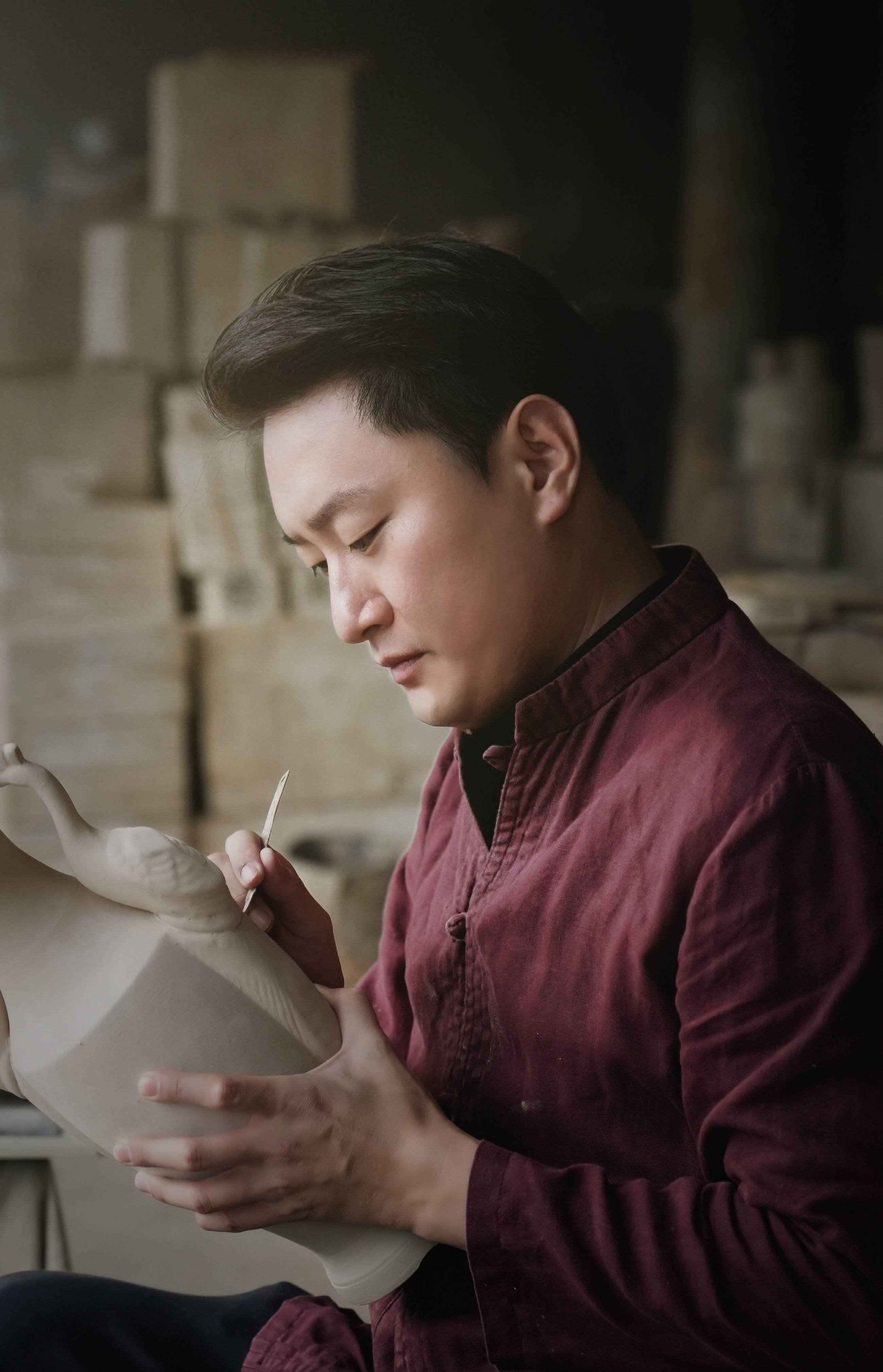 刘雨泉先生执守祖辈技艺,更注入当代审美哲思。在原有器型基础上,重构比例、精炼线条,使瓶身更显挺拔端庄;蟠龙造型在柔化中更具流动感,如云中隐现,刚柔相济。器型在继承中蜕变,既见古韵,亦显新生。