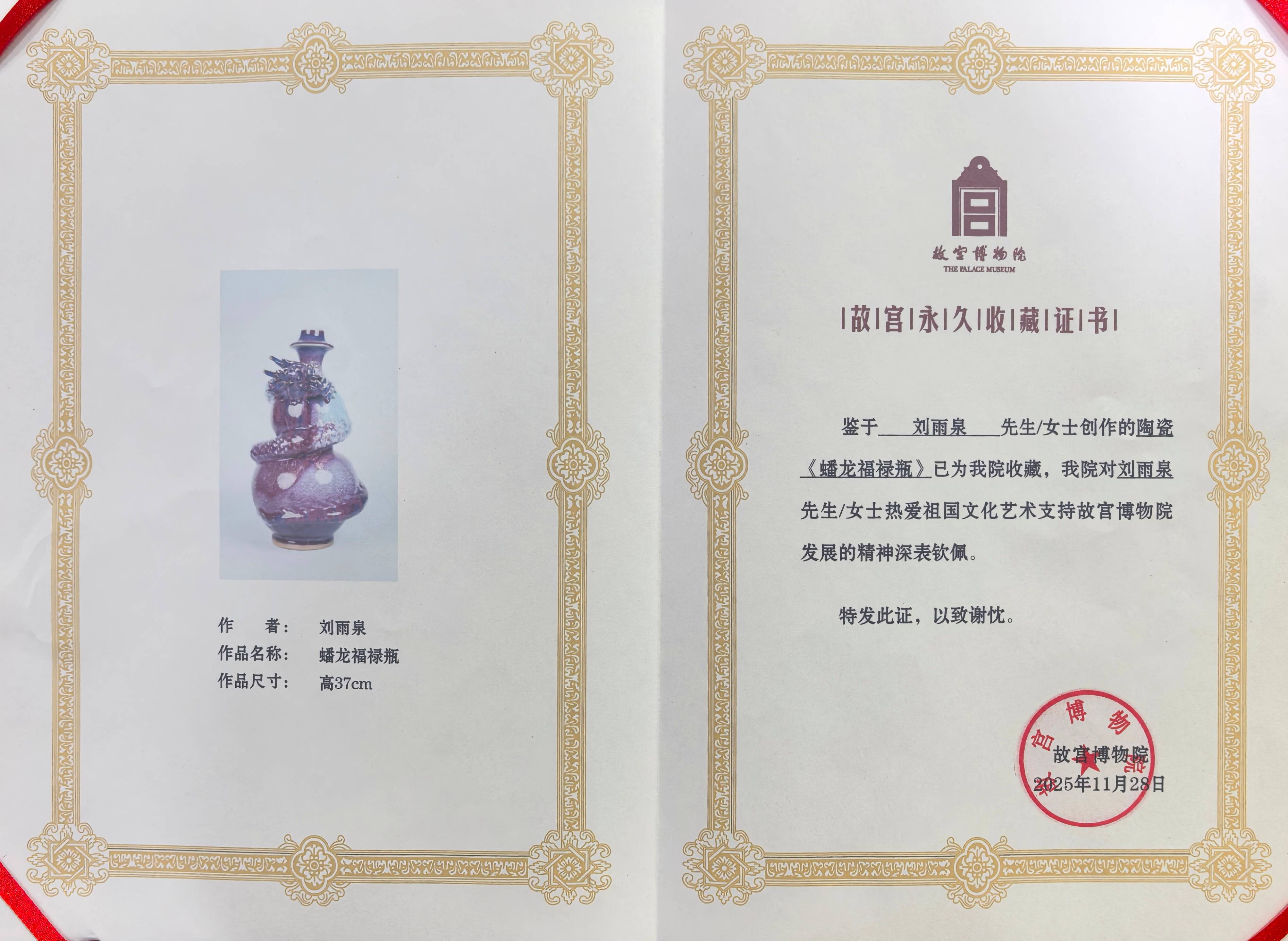 瓷辉钧窑第三代传承人 刘雨泉作品《蟠龙福禄瓶》于2025年11月28日,被中国故宫博物院永久收藏。