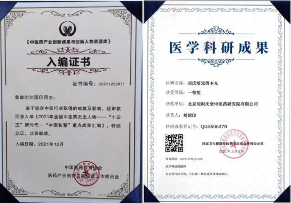 刘国印在继承祖学,古今结合;广集中医药奇单验方,尤其运用中医药对疑难杂症临床研究上成果卓著,他结合临床,在培元固本理论基础上,研制的中药效验方“刘氏培元固本丸”以五行五脏相生理论体系。补肾可以生精,精生骨髓,骨髓增加了,人体的造血功能就会强大,从而补充肝脏储藏血液的不足和新旧更替,分解毒素,保证心血的供应质量。心血得到涵养和充分的供给,心脏跳动就有活力,全身的血液流通就会畅通无限心之阴阳气血旺盛·可生养脾土,健脾胃,脾土之阴阳气血旺盛,可生养肺金,肺金之阴阳气血旺盛,可洗肺洁瘀化痰,可以增加肺活量,改善肺缺氧症状增强气泡的作用结金有可生养肾水,五行五脏之气血阴阳相生,如循环之无端。气与血充盈,即可气帅血行,血随气动,气血旺盛,促使任、督二脉畅通。任、督二脉畅通,十二经脉、十五经络皆畅通。始终保持这种旺盛的正气,保持身体五脏六腑的阴阳平衡,则百邪不侵,百病不生。刘氏培元固本丸临床上主要治疗,机体免疫力低下,导致的习惯性感冒、颈椎病、腰椎病、畏寒肢冷体倦乏力、心脑血管病、肿瘤、癌症等证。内服鼻炎丸““鼻炎外用喷剂”对肺癌,支气管炎、哮喘肺心病,鼻炎、过敏性鼻炎、萎缩性鼻炎、鼻窦炎,均有很好疗效。刘医生通过几十年的临床经验,在家传秘验方基础上,结合培元固本理论体系,研制出了"散结消肿片"在2021年3月22日国家卫生健康委医药卫生基金管理办公室举办的科研成果选评活动中,荣获一等奖,科研成果登记号0G560684N,"鲁肠安胶囊"在2021年9月7号国家卫生健康委医药卫生基金管理办公室举办的科研成果选评活动中,荣获一等奖,科研成果登记号QG560725N,“刘氏培元固本丸”在2021年9月9号国家卫生健康委医药卫生基金管理办公室举办的科研成果选评活动中,荣获一等奖,科研成果登记号QG560637N,在35年临床诊疗过程中,不断学习,日益进取,精益求精。学研结合,守旧创新,不但在临床上运用纯中医中药疗法,能起到来病先防,已病防变的作用,切实能为患者解决难题。用药方面,用好药良心药,才能达到应有的疗效,作好医生,良心医生,真心实意为患者利益考虑,细心诊断,精心治疗。做到行方、智园、心小、胆大,用药方能恰到好处,方能取得好的疗效。