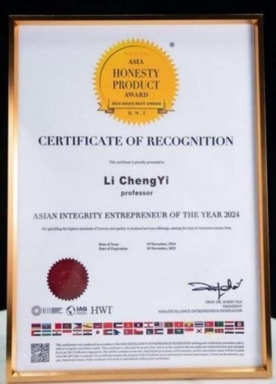 亚洲诚信大奖(Asia Honesty Award,AHA)由亚洲精英企业家联盟AEEF主办,豪威国际集团HWT GROUP与国际品质促进会IAQ协办。奖项设立宗旨在于推动企业诚信度,以表扬他们以诚信为本的崇高精神。自2013举办至今,亚洲诚信大奖已成为商界的信誉标志,被广泛主流媒体与机构媲美为“商界诺贝尔“,每年吸引超过万家企业争相提名。该奖项一共分为5个项目:亚洲年度蝉联百强诚信品牌大奖、亚洲年度百强诚信品牌大奖、亚洲诚信企业大奖、亚洲诚信企业家大奖、亚洲诚信产品大奖,至今,已有超过1000个来自世界各地优秀品牌,获得此项殊荣,成为消费者心目中的优质与诚信品牌的代表,获奖品牌能够在激烈的市场竞争中以诚信经营脱颖而出。因李乘伊教授在中医理疗,推进人类健康发展过程中倡导的正直和诚信,被授于亚洲诚信企业家大奖。