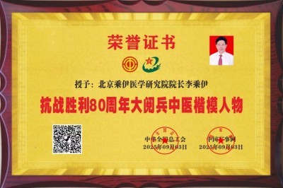 用于表彰李乘伊院长在中医领域于抗战胜利80周年大阅兵中的突出贡献与楷模典范作用。