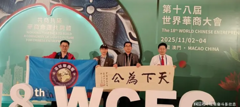 李乘伊院士赠送自己创作的“ 天下为公 ”书法作品给澳门《环球华商报》社长兼总编辑、世界华商精英联合总会 会长周新先生( 右二 )并合影留念。