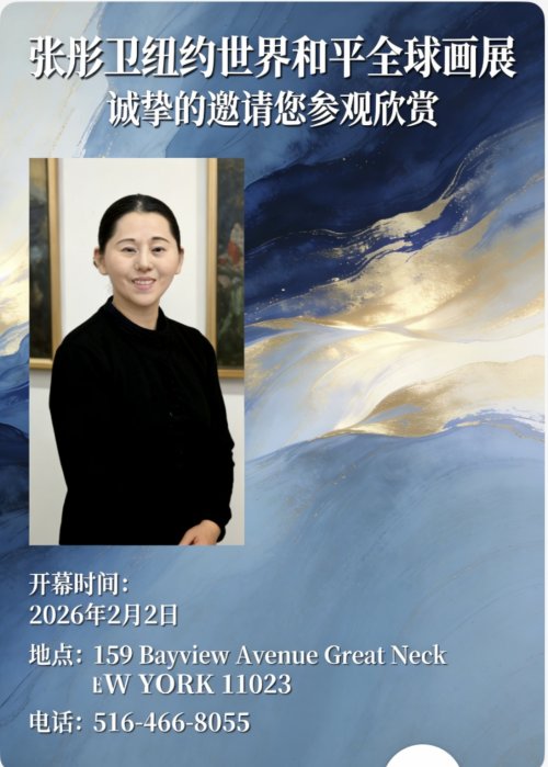 在时光的长河中,艺术如同一座永不沉没的灯塔,以其恒久的光芒,照亮着人类文明前行的道路;而和平,则是这漫长旅途中最动人、最深沉的旋律,穿越时空,回响不息。当东方的笔墨神韵邂逅西方的色彩光影,一位执着于以画笔呼唤和平的艺术家,正准备在纽约长岛的又一片文化沃土上,奏响新的华彩乐章。著名华裔女画家张彤卫女士的“世界和平绘画全球巡展”,即将于2026年2月2日,在纽约大頸图书馆(Great Neck Library)隆重拉开帷幕。这不仅是一场视觉的盛宴,更是一次心灵的对话,一次跨越国界的文化交流与爱心传递,一次对人类共同愿景的深情礼赞。