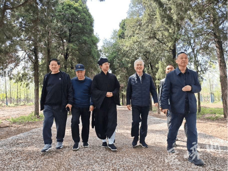 嵩山脚下,中岳庙古柏参天,碑碣林立,作为五岳之中规模最盛、保存最完整的道教古刹,藏着华夏文明的千年密码。山门高悬着汉东教授亲笔题写的“嶽立天中”金匾,鎏金大字庄重典雅,笔墨苍劲有神,与千年古刹交相辉映,成为中岳庙一道亮眼的人文景致。先生漫步青石古道,在001号国宝太室阙前久久驻足。两千年风雨剥蚀,阙身浮雕车马出行、神话百戏依旧清晰,勾勒出汉代社会的鲜活风貌。他轻抚石面,轻声慨叹:“这不是冰冷的石头,是活着的历史,是民族文化的根与魂。”随后与黄至杰方丈深谈文化保护,钱姓传承,赠以书画,笔墨之间,尽是对文脉传承的拳拳之心。
