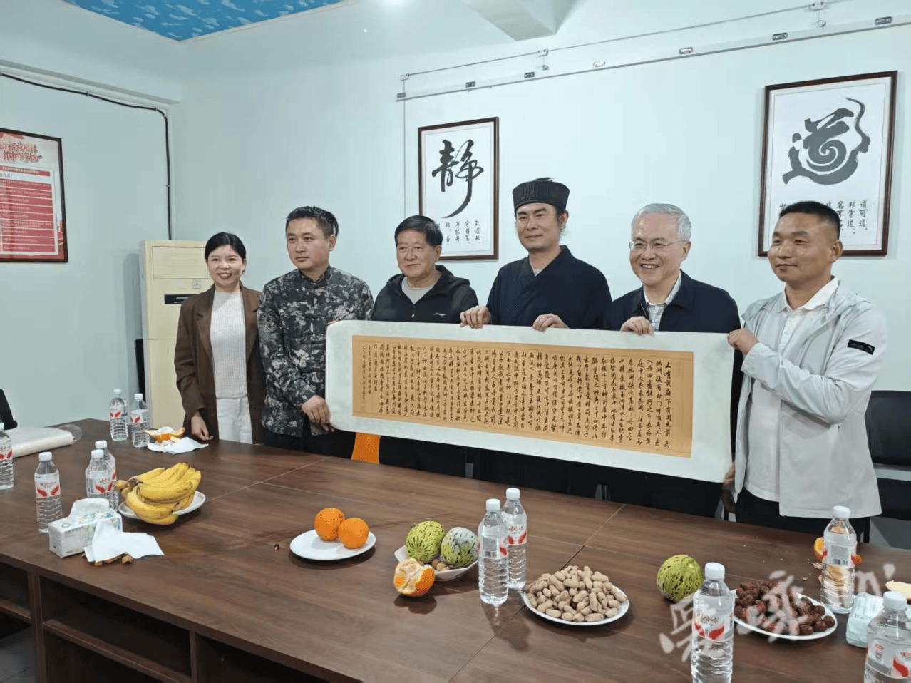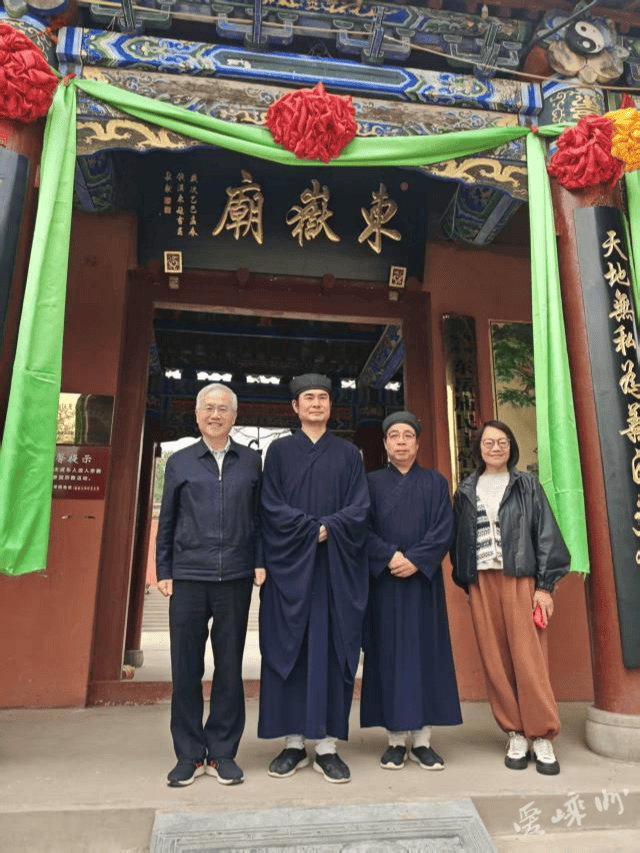 首站抵达郑州航空港区东岳庙。山门之上,先生亲笔题写的“东岳庙”匾额黑底金字,笔力遒劲,融端庄厚重与笔墨灵动气韵于一体,在日光下熠熠生辉。先生缓步其间,目光拂过古建飞檐、碑刻残石,对记载明代重修的残碑俯身细辨,指尖轻拂浮尘,似与百年历史轻声对话。谈及匾额,他只谦逊一笑:“不过是尽一份对传统文化的心意,庙宇真正的价值,在于信仰的延续与文化的传承。”寥寥数语,尽显学者的淡泊与赤诚。其间,汉东教授还向东岳庙赠送了书法作品。